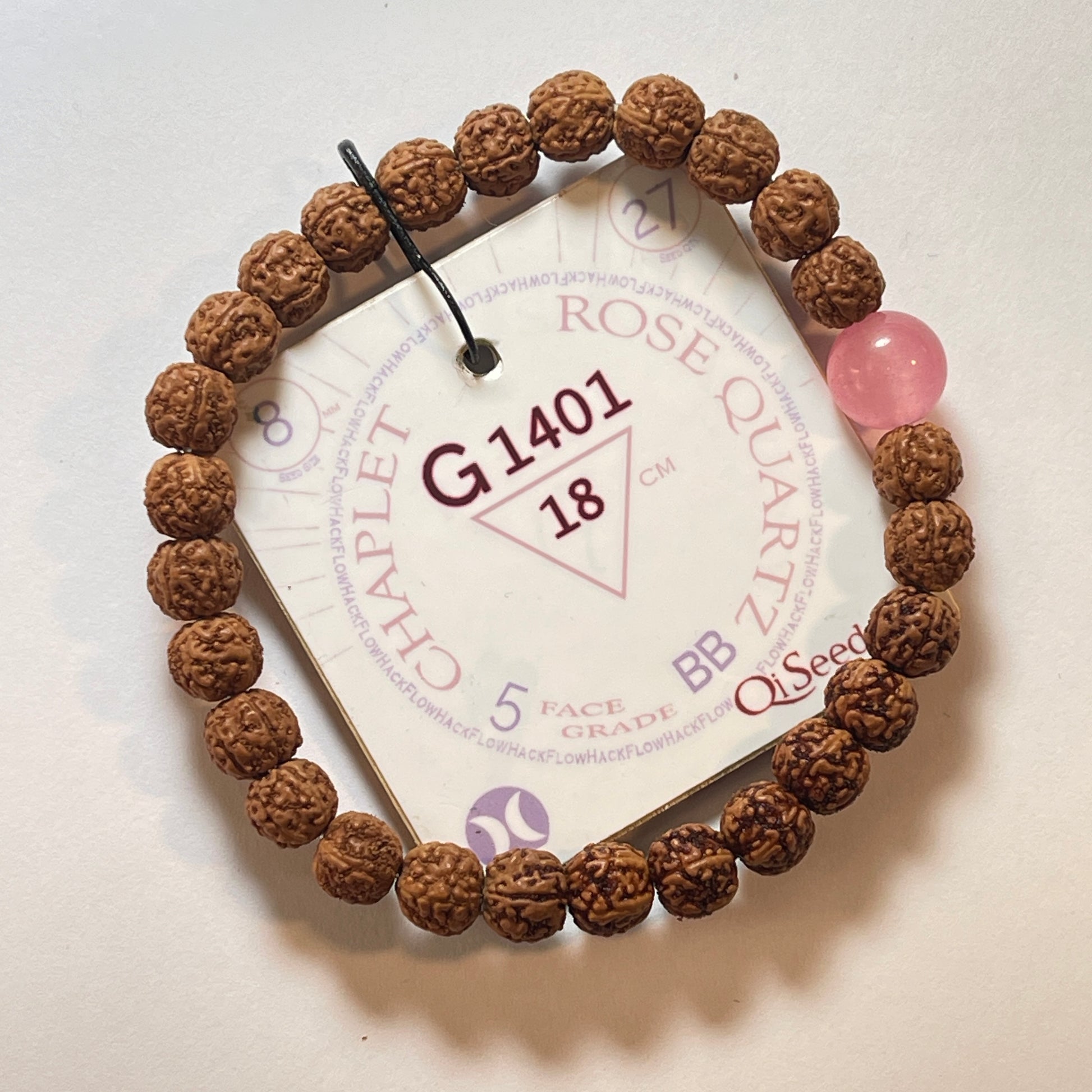 This lovely Chaplet fits a 18 cm wrist, has a single Rose Quartz bead and 27 Rudraksha stones ( endocarp or seed pod). Each Rudraksha is 8 mm, with 5 faces, (which means 6 seeds are in each stone, that is 162 living (viable) seeds are in this Chaplet .